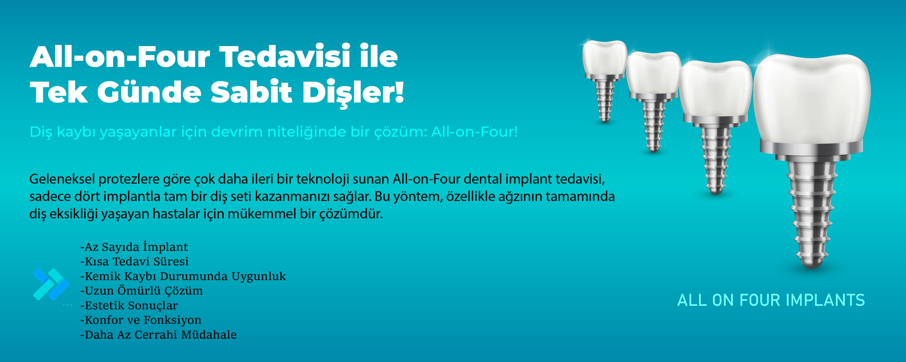 All-on-Four, çene kemiğine yalnızca 4 adet implant yerleştirilerek, bir bütün olarak sabit protez dişlerin takılmasını sağlayan bir tedavi yöntemidir. Bu işlemle, dişsiz kalan hastalar kısa sürede estetik ve fonksiyonel açıdan tatmin edici sonuçlar elde eder.